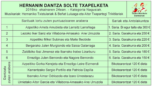 2016ko ekainaren 24ean arratsaldeko seiretan ospatu zen ohitura den bezela Hernaniko Dantza Solte Txapelketa. Hamar dantzari bikoten parte hartu zuten. Ondorengo argazkietan agertzen dira Saria lortu zuten sei bikoteak. Zorionak denori